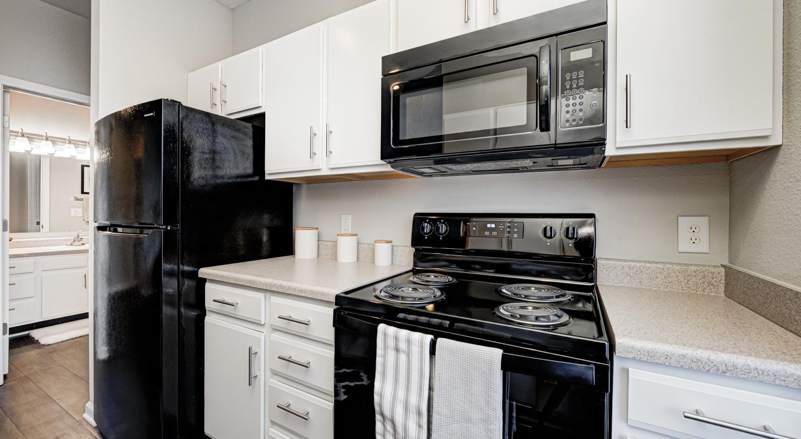 • Kitchen with white cabinets and black appliances